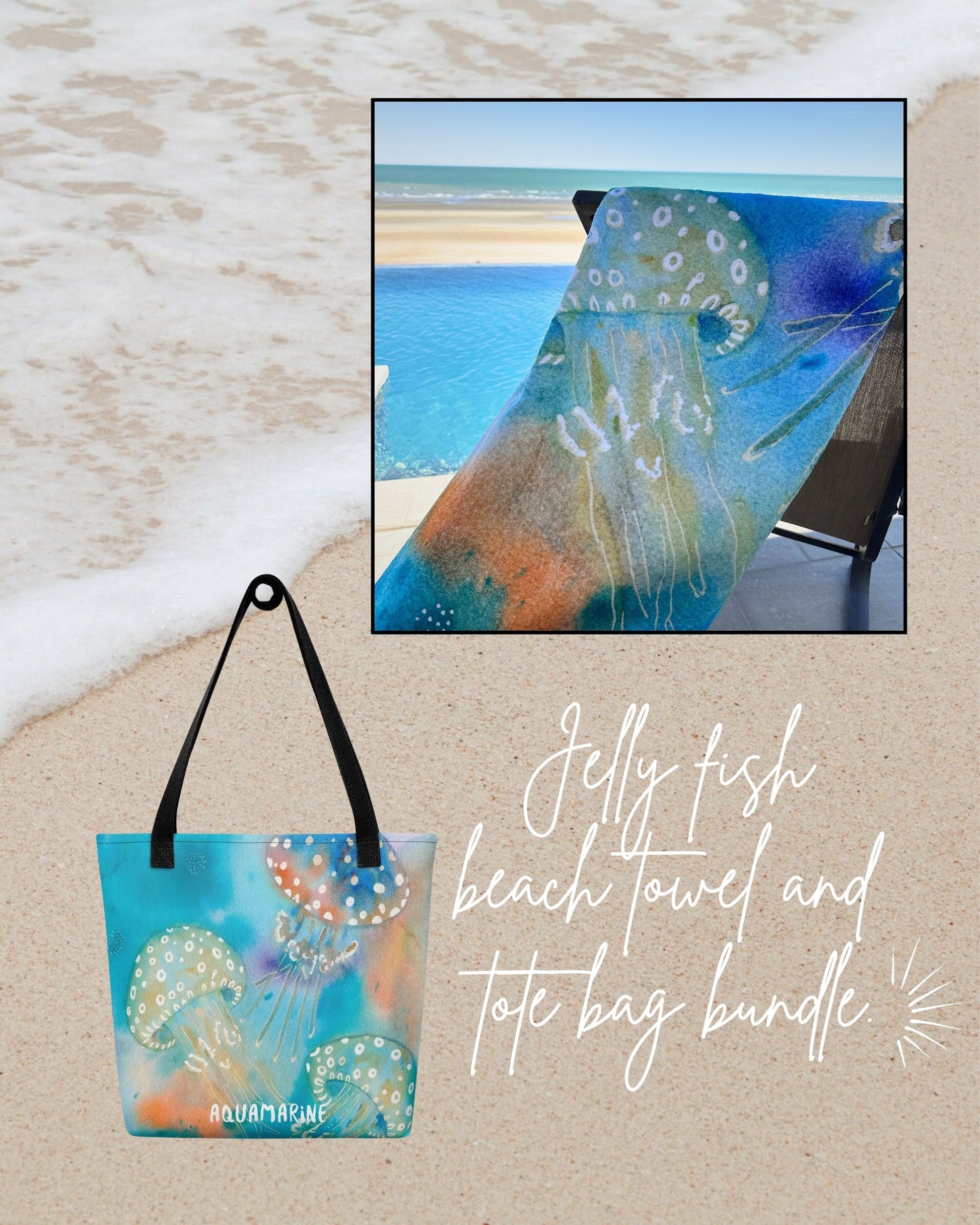 Make a splash this summer with our vibrant Jellyfish Bundle, featuring a matching beach towel and tote bag adorned with whimsical jellyfish from my original watercolor artwork. Inspired by the colors of the ocean, this bundle brings a dreamy, artistic touch to your beach days.