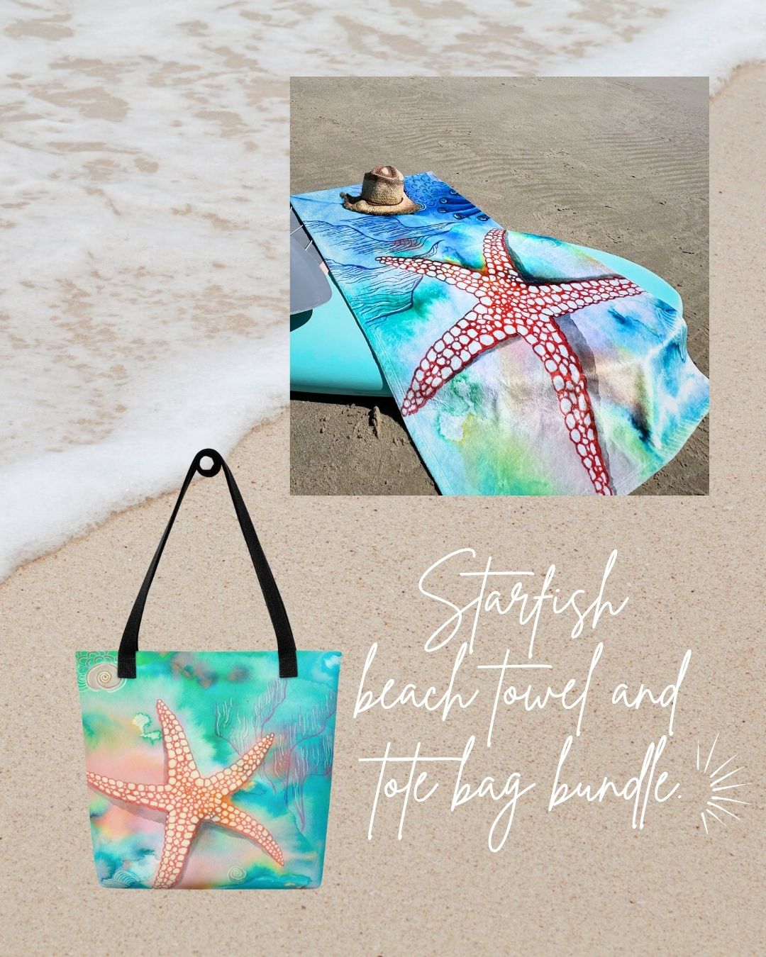 With its striking starfish design in coral and ivory tones against turquoise and aqua backdrops, this bundle is your perfect companion for beach days, poolside lounging, or summer travels.